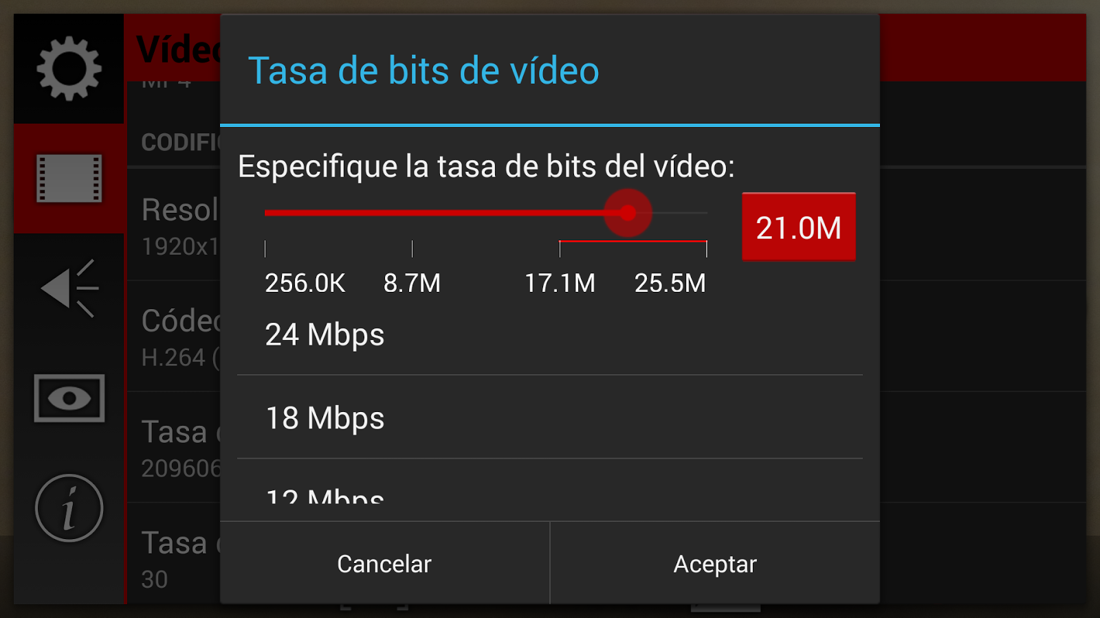 ● Escoja el códec de vídeo y audio, ajuste sus bitrates, tasa de muestreo de audio y número de canales (estéreo o mono).