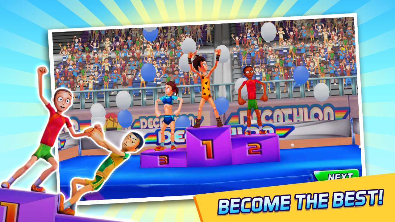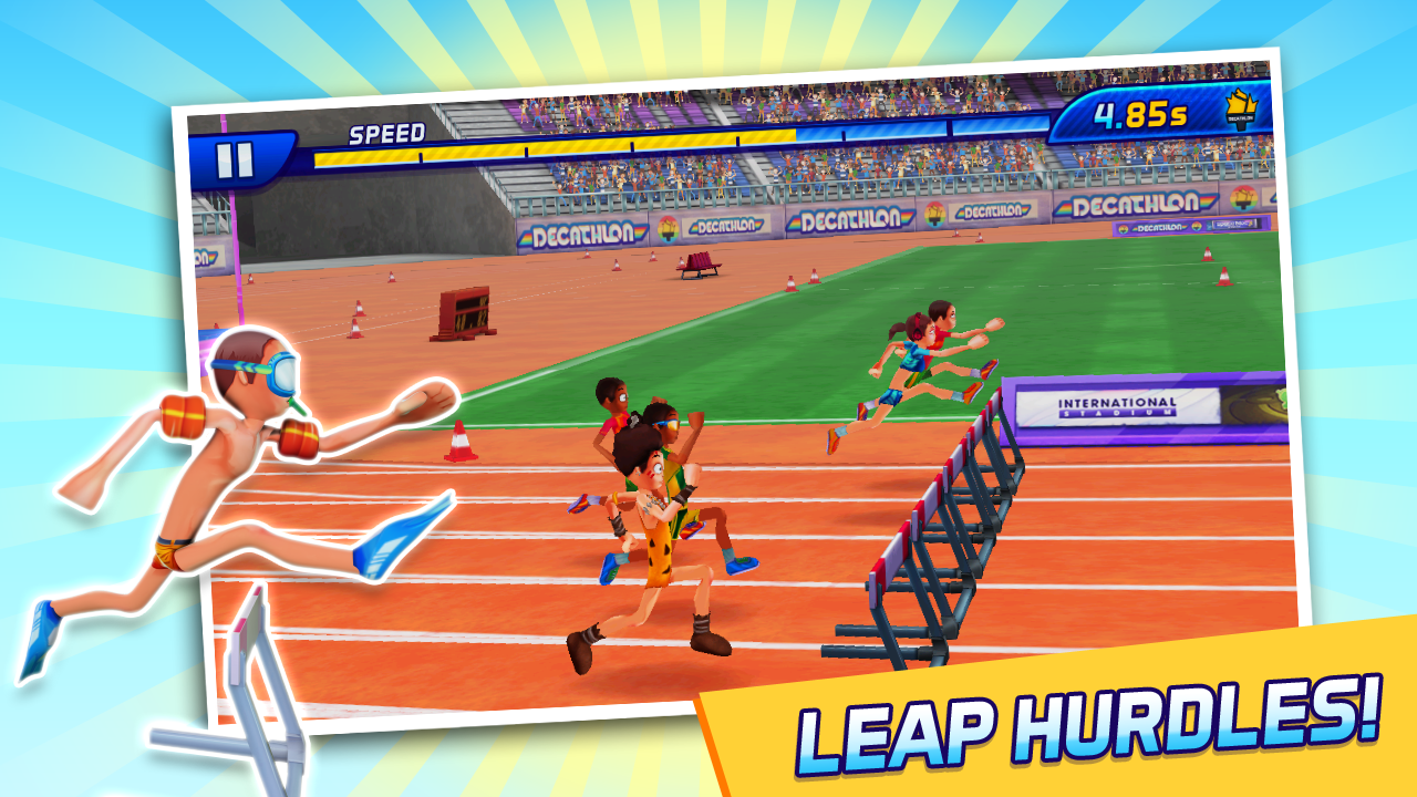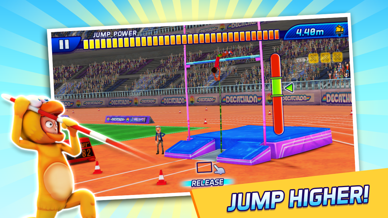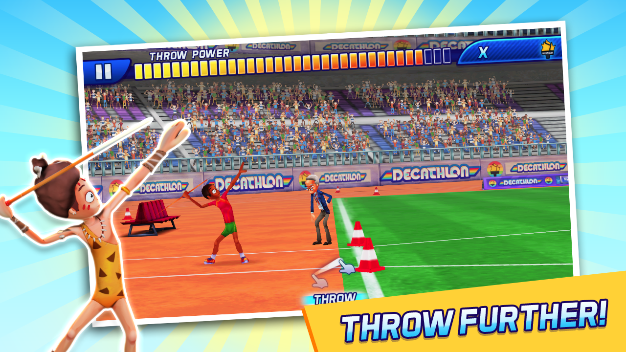 ¡Demuestra tu valía en 10 eventos! 100 m, 400 m, 1500 m, 100 m vallas, salto de longitud, salto de altura, salto con pértiga, lanzamiento de jabalina, lanzamiento de pesa y lanzamiento de disco.