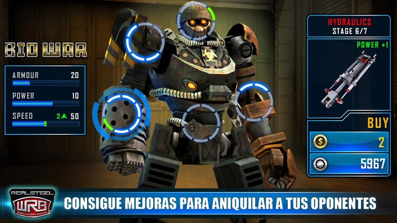Real Steel: World Robot Boxing reparte más puñetazos, ofrece combates más impactantes y duplica la acción de su predecesor. Contempla el todopoderoso Zeus como nunca antes con los nuevos gráficos en alta definición. ¡Desafía a nuevos contrincantes de cromo como Biowar y Hollowjack con los populares Atom, Noisyboy y otros! En un futuro no muy lejano donde el boxeo se ha llevado al extremo, las personas y los robots se sincronizan para obtener una experiencia de entretenimiento descomunal. ¡Pilota un colosal robot demoledor y reparte golpes y ganchos a diestro y siniestro hasta conseguir la victoria!