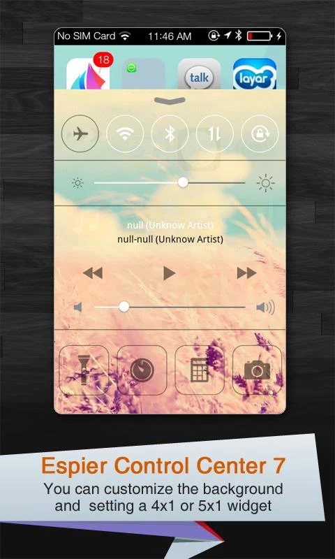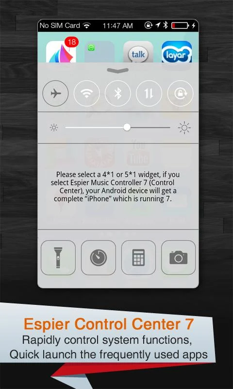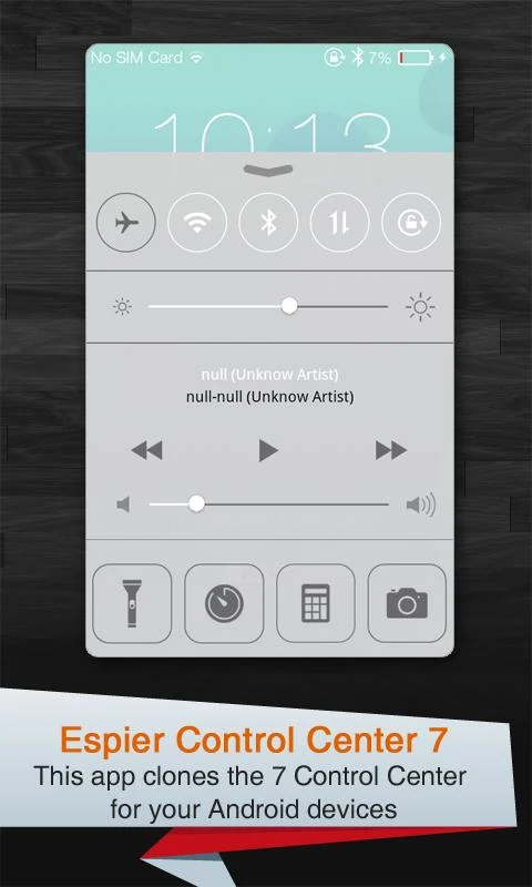 Espier Centro de Control 7 es un plugin para Espier Lanzador de 7 (o Espier Lanzador) en estilo plano. Esta aplicación puede ayudar a controlar rápidamente el funcionamiento del sistema, tales como el modo de avión, Wi-Fi, Wireless, Bluetooth, etc. También le puede ayudar a inicio rápido de algunas aplicaciones de la herramienta, como linterna, reloj, calculadora, y la cámara. Mediante el uso de otras aplicaciones Espier (Espier Launcher 7, Espier Notificaciones 7 y Espier Locker Screen 7; Las ediciones Pro de estas aplicaciones son También disponible en Google Play), su dispositivo Android conseguirá una transformación completa.