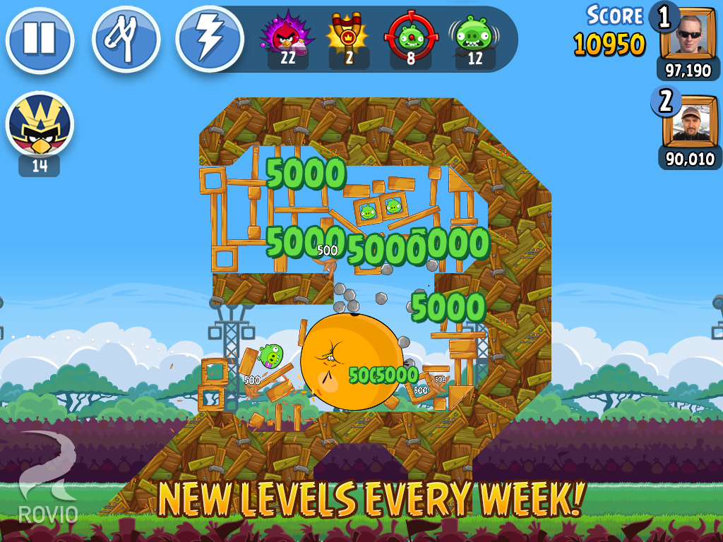 - ¡Machaca a los cerdos con cinco potenciadores, uno de ellos exclusivo de la versión para móvil de Angry Birds Friends!