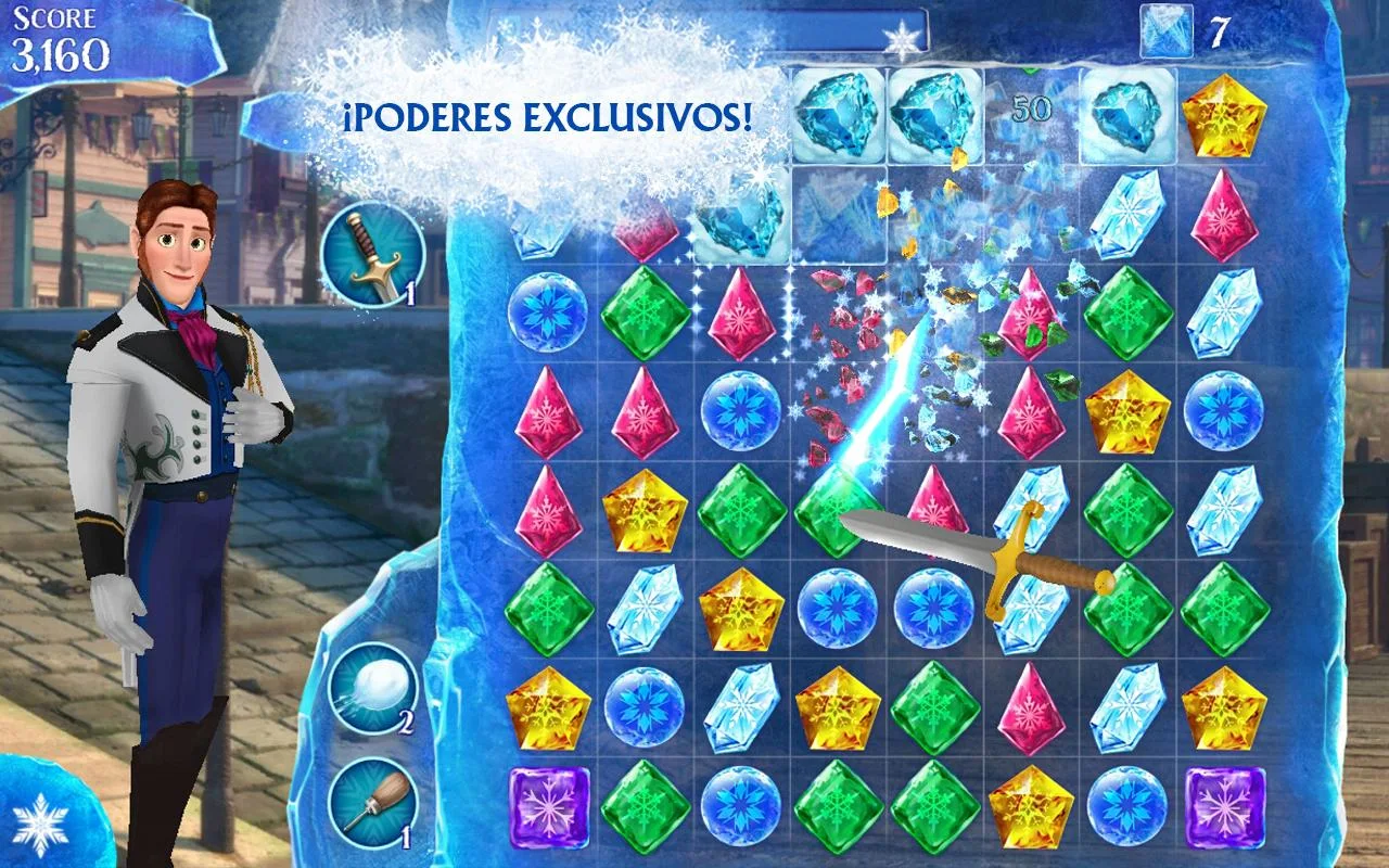 PODERES EXCLUSIVOS DISEÑADOS ESPECIALMENTE PARA CADA PERSONAJE – Usa la antorcha de Anna para quemar una fila entera de cristales, o el poder del glaciar de Elsa para hacer que todos los cristales del mismo color desaparezcan como por arte de magia. ¡Prueba la espada de Han y corta los cristales de un solo tajo! ¡Aún hay más poderes increíbles por descubrir!