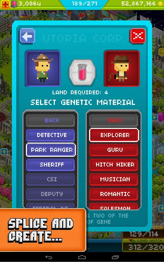 Salude nuevos clones a Utopía en el centro de la llegada, a continuación, a encontrar un lugar en su nuevo mundo. Empalme genes de residentes y combinar sus habilidades para descubrir nuevos Pixel gente a unirse a su ciudad próspera.